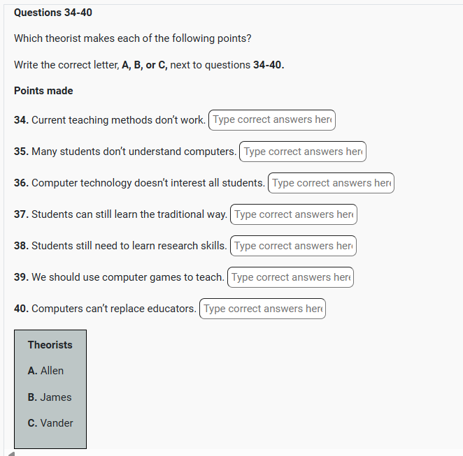 Allen maintains that while most young students are proficient in playing computer games and using the web in quite basic ways. They’re not used to using the computer at Advanced levels. For example to conduct complex information searches which are so necessary for University study today. Irrespective of Alan’s research James believes it’s possible for Q39 computer games to play a major role in making classroom learning more stimulating and he cites many instances where this would be possible today. However, Vander asserts that rather than focusing on developing games Q40 we should think of better ways to assist teachers because no computer program comes close to doing what a human teacher does every day.