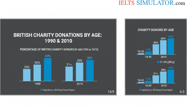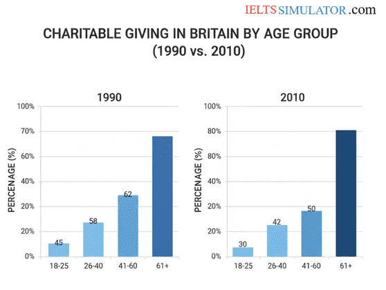 The chart below gives information on the percentage of British people giving money to charity by age range for the years 1990 and 2010.