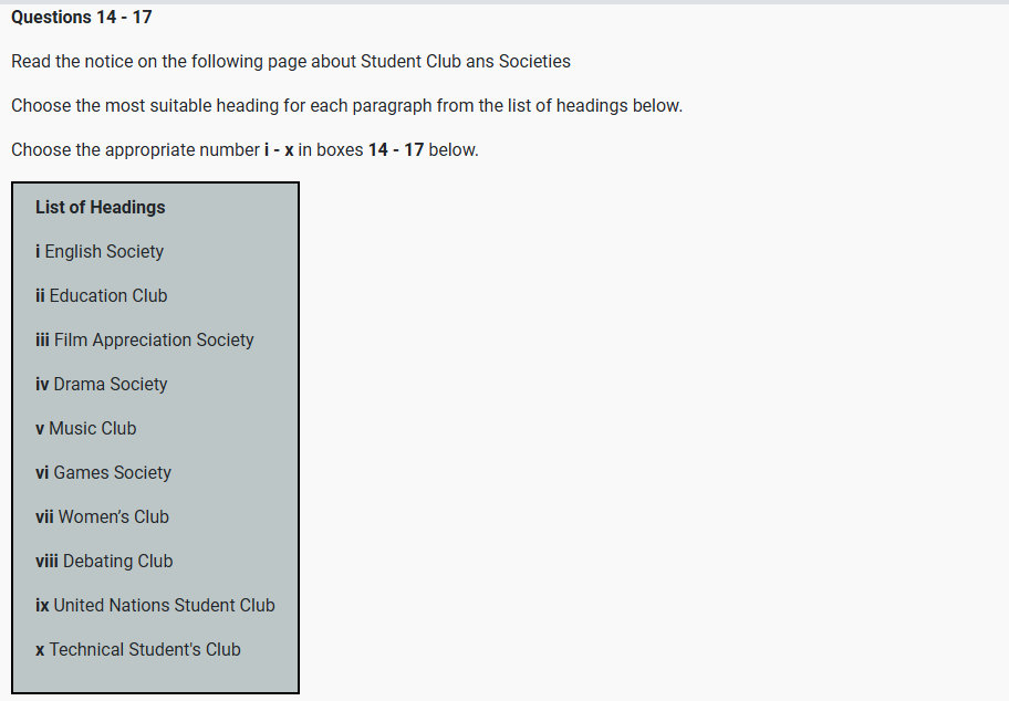IELTS READING STUDENT CLUBS AND SOCIETIES Reading Practice Test has 10 Questions belongs to the Social Activities / Leisure subject.. |