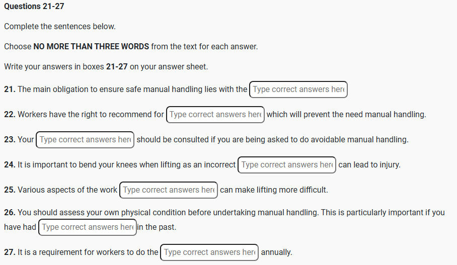 IELTS READING Health and Safety in a workplace: Manual Handling Reading Practice Test has 10 Questions belongs to the Workplace Safety & Regulations subject.. |