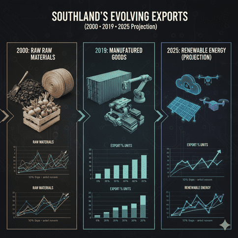 Southland’s main exports in the year 2000, 2019 and future projections for 2025.