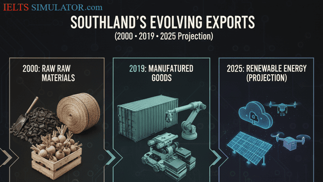 IELTS Writing Task 1: Southland’s Export Trends in 2000, 2019 and 2025 (Projected)