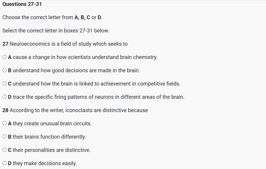 In the last decade, a revolution has occurred in the way that scientists think about the brain. We now know that the decisions humans make can be traced to the firing patterns of neurons in specific parts of the brain. Q27 These discoveries have led to the field known as neuroeconomics, which studies the brain’s secrets to success in an economic environment that demands innovation and being able to do things differently from competitors. A brain that can do this is an iconoclastic one. Briefly, an iconoclast is a person who does something that others say can’t be done.