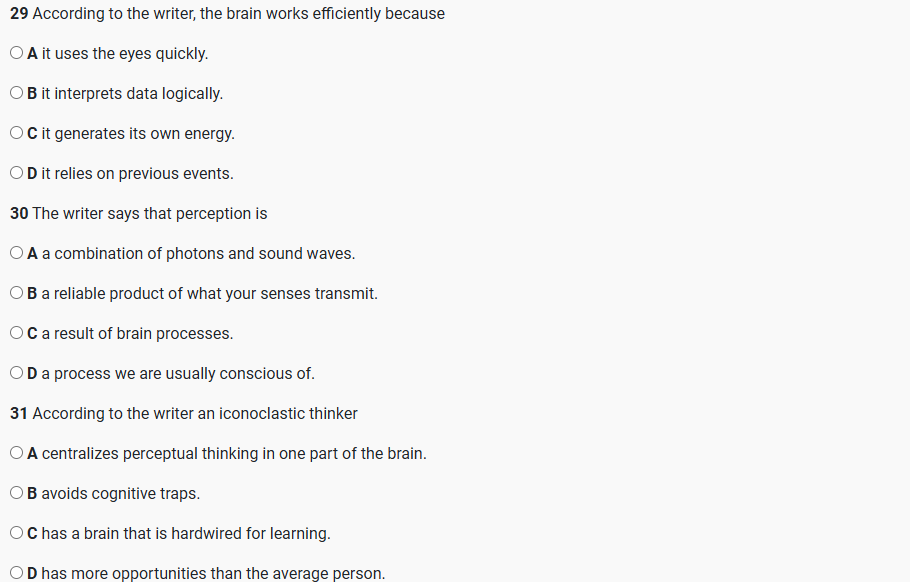 The first thing to realize is that the brain suffers from limited resources. It has a fixed energy budget, about the same as a 40 watt light bulb, so it has evolved to work as efficiently as possible. This is where most people are impeded from being an iconoclast. For example, when confronted with information streaming from the eyes, the brain will interpret this information in the quickest way possible. Thus Q29 it will draw on both past experience and any other source of information, such as what other people say, to make sense of what it is seeing. This happens all the time. The brain takes shortcuts that work so well we are hardly ever aware of them. We think our perceptions of the world are real, but they are only biological and electrical rumblings. Perception is not simply a product of what your eyes or ears transmit to your brain. More than the physical reality of photons or sound waves, Q30 perception is a product of the brain.