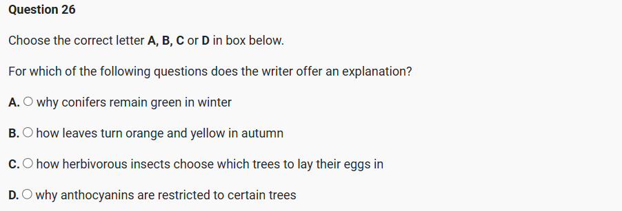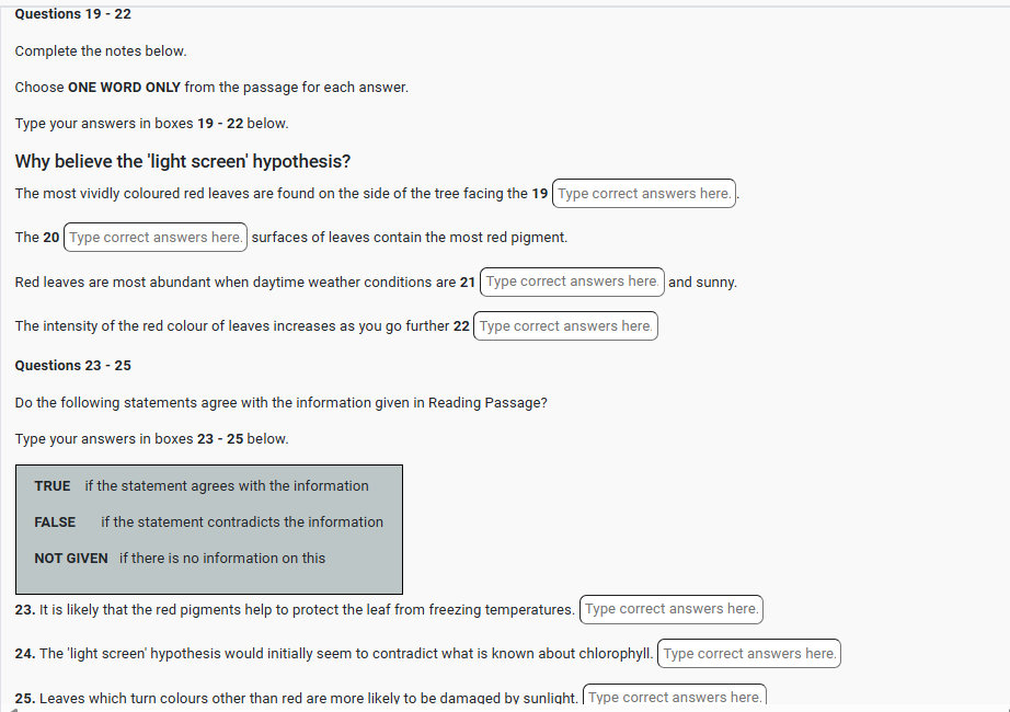 Q25 Leaves which turn colours other than red are more likely to be damaged by sunlight. NOT GIVEN