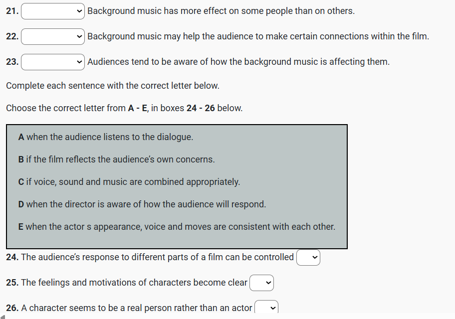 Q27 Though we might think of film as an essentially visual experience, we really cannot afford to underestimate the importance of film sound. A meaningful soundtrack is often as complicated as the image on the screen and is ultimately just as much the responsibility of the director. The entire soundtrack consists of three essential ingredients: the human voice, sound effects, and music. Q24 These three tracks must be mixed and balanced so as to produce the necessary emphases which in turn create desired effects so as to produce the necessary emphases which in turn create desired effects.