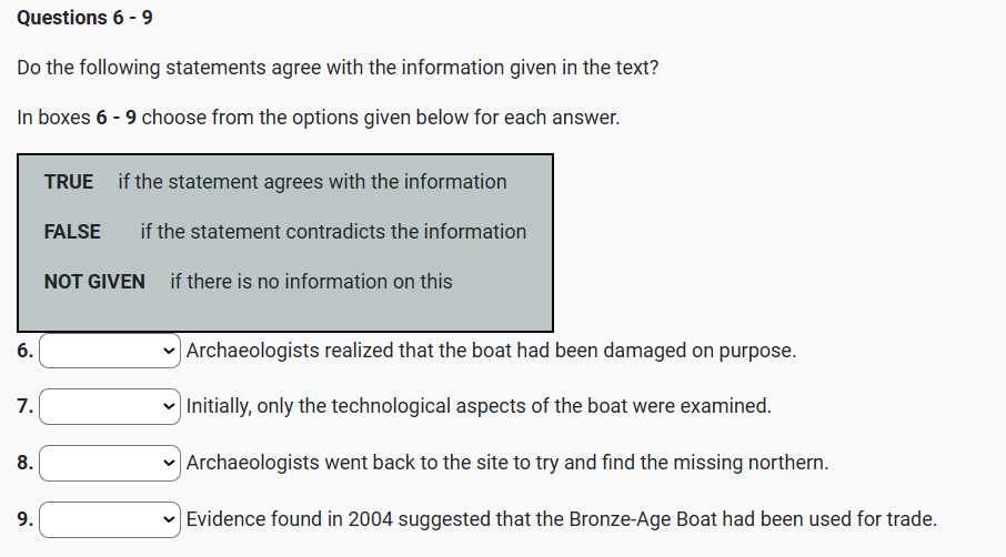 Q9 Evidence found in 2004 suggested that the Bronze-Age Boat had been used for trade. NOT GIVEN