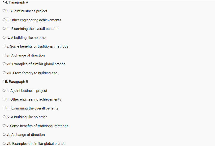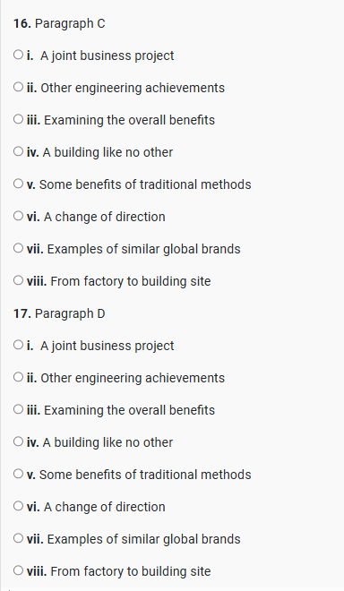 D. For two decades, Zhang’s AC business boomed. But a couple of events conspired to change his course. The first was that Zhang became an environmentalist. The second was the earthquake that hit China’s Sichuan Province in 2008, causing the collapse of poorly constructed buildings. Initially, he says, he tried to convince developers to refit existing buildings to make them both more stable and more sustainable, but he had little success. So Zhang drafted his own engineers and started researching how to build cheap, environmentally friendly structures that could also withstand an earthquake. Within six months of starting his research, Zhang had given up on traditional methods. He was frustrated by the cost of hiring designers and specialists for each new structure. The best way to cut costs, he decided, was to take building to the factory. But to create a factory-built skyscraper, Broad had to abandon the principles by which skyscrapers are typically designed. Q17 The whole load-bearing structure had to be different. To reduce the overall weight of the building, it used less Q22 concrete in the floors; that in turn enabled it to cut down on structural steel.