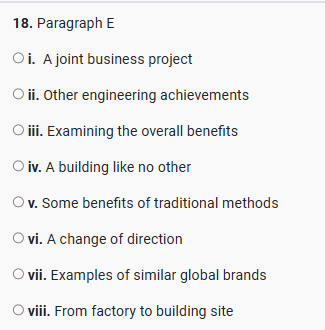 E. Around the world, prefabricated and modular buildings are gaining in popularity. But modular and prefabricated buildings elsewhere are, for the most part, low- rise. Broad is alone in applying these methods to skyscrapers. For Zhang, the environmental savings alone justify the effort. Q18 According to Broad’s numbers, a traditional high-rise will produce about 3,000 tons of construction waste, while a Broad building will produce only 25 tons. Traditional buildings also require 5,000 tons of water onsite to build, while Broad buildings use none. The building process is also less dangerous. Elevator systems – the base, rails, and machine room – can be installed at the factory, eliminating the risk of injury. And instead of shipping an elevator car to the site in pieces, Broad orders a finished car and drops it into the shaft by crane. In the future, elevator manufacturers are hoping to preinstall the doors, completely eliminating any chance that a worker might fall. ‘Traditional construction is chaotic,’ he says. ‘We took construction and moved it into the factory.’ According to Zhang, his buildings will help solve the many problems of the construction industry and what’s more, they will be quicker and cheaper to build.
