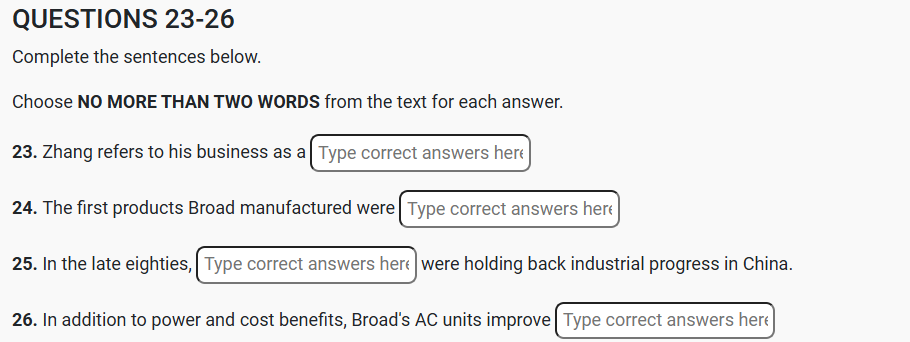 C. Zhang attributes his success to his creativity and to his outsider perspective on technology. He started out as an art student in the 1980s, but in 1988, Zhang left the art world to found Broad. The company started out as a maker of non-pressurized Q24 boilers. His senior vice-president, Juliet Jiang, says, ‘He made his fortune on boilers. He could have kept doing this business, but … Q16 he saw the need for nonelectric air-conditioning.’ Towards the end of the decade, China’s economy was expanding past the capacity of the nation’s electricity grid, she explains. Q25 power shortages were becoming a serious obstacle to growth. Large air-conditioning (AC) units fueled by natural gas could help companies ease their electricity load, reduce overheads, and enjoy more reliable Q26 climate control into the bargain. Today, Broad has units operating in more than 70 countries, in some of the largest buildings and airports on the planet.