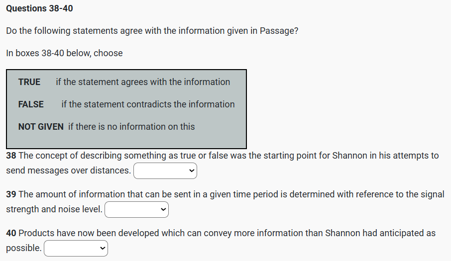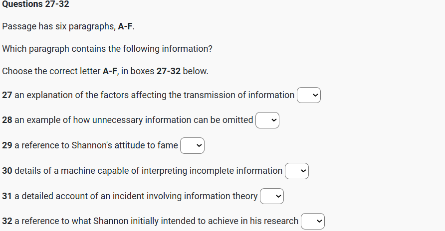 C. This all seems light years away from the down-to-earth uses Shannon originally had for his work, which began when he was a 22-year—old graduate engineering student at the prestigious Massachusetts Institute of Technology in 1939. Q32 He set out with an apparently simple aim: to pin down the precise meaning of the concept of ‘information’. The most basic form of information, Shannon argued, is whether something is true or false – which can be captured in the binary unit, or ‘bit’, of the form 1 or 0. Q38 Having identified this fundamental unit, Shannon set about defining otherwise vague ideas about information and how to transmit it from place to place. ln the process he discovered something surprising: it is always possible to guarantee information will gel through random interference – ‘noise’ — intact.