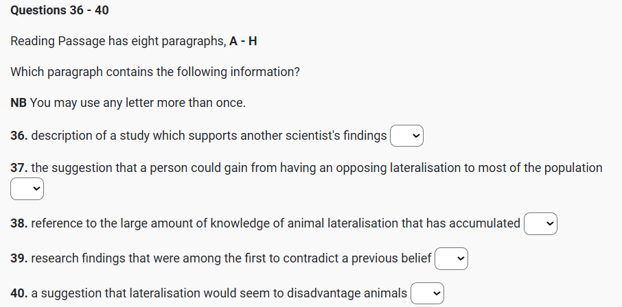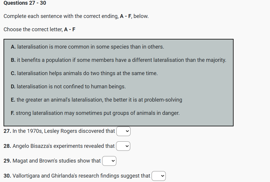 B. Q38, Q39 For many years it was assumed that lateralisation was a uniquely human trait, but this notion rapidly fell apart as researchers started uncovering evidence of lateralisation in all sorts of animals. For example, in the 1970s, Lesley Rogers, now at the University of New England in Australia, was studying memory and learning in chicks. Q27 She had been injecting a chemical into chicks’ brains to stop them learning how to spot grains of food among distracting pebbles, and was surprised to observe that the chemical only worked when applied to the left hemisphere of the brain. That strongly suggested that the right side of the chicks brain played little or no role in the learning of such behaviours. Similar evidence appeared in songbirds and rats around the same time, and since then, researchers have built up an impressive catalogue of animal lateralisation.