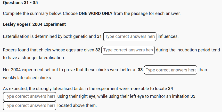 D. Genetics plays a part in determining lateralisation, but Q31 environmental factors have an impact too. Rogers found that a chick’s lateralisation depends on whether it is exposed to Q32 light before hatching from its egg — if it is kept in the dark during this period, neither hemisphere becomes dominant. In 2004, Rogers used this observation to test the advantages of brain bias in chicks faced with the challenge of Q7 multitasking. She hatched chicks with either strong or weak lateralisation, then presented the two groups with Q33 multitasking hidden among small pebbles and the threatening shape of a fake predator flying overhead. As predicted, the birds incubated in the light looked for Q34 food mainly with their right eye, while using the other to check out the Q35 predactor. The weakly-lateralised chicks, meanwhile, had difficulty performing these two activities simultaneously.