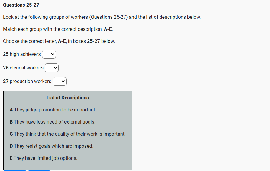 There is an abundance of evidence to support the motivational benefits that result from carefully matching people to jobs. For example, if the job is running a small business or an autonomous unit within a larger business, high achievers should be sought. However, if the ob to be filled is a managerial post in a large bureaucratic organisation, a candidate who has a high need for power and a low need for affiliation should be selected. Accordingly, high achievers should not be put into jobs that are inconsistent with their needs. Q21 High achievers will do best when the job provides moderately challenging goals and where there is independence and feedback. However, it should be remembered that not everybody is motivated by jobs that are high in independence, variety, and responsibility.