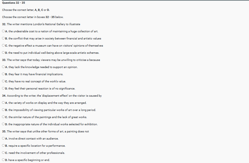 This is particularly distressing because time seems to be a vital factor in the appreciation of all art forms. Q35 A fundamental difference between paintings and other art forms is that there is no prescribed time over which a painting is viewed. By contrast, the audience encourage an opera or a play over a specific time, which is the duration of the performance. Similarly novels and poems are read in a prescribed temporal sequence, whereas a picture has no clear place at which to start viewing, or at which to finish. Thus art works themselves encourage us to view them superficially, without appreciating the richness of detail and labour that is involved.