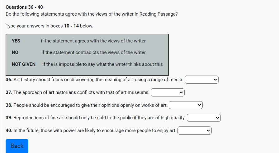 Q36 Art history should focus on discovering the meaning of art using a range of media. NOT GIVEN