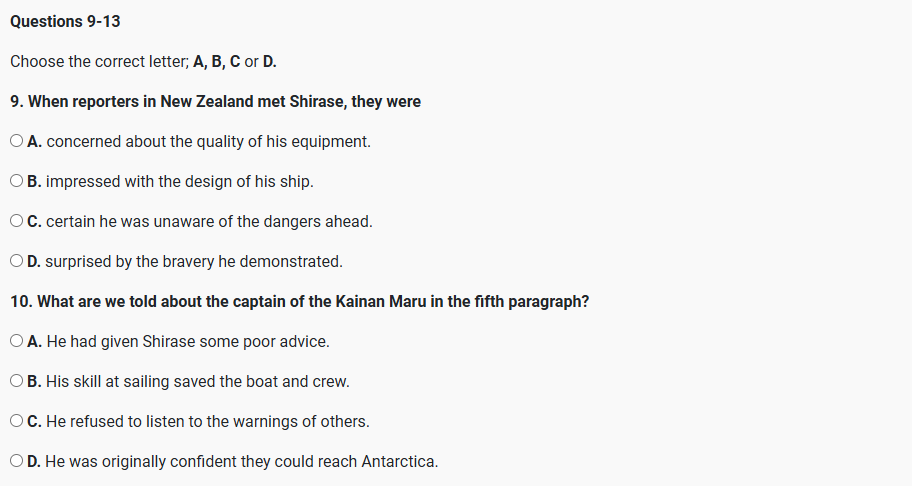 Q6 The response from the government was cool, however, and Shirase struggled to raise funds. Fortunately, a few months later, Japan’s former prime minister Shigenobu kuma came to Shirase’s rescue. With kuma’s backing, Shirase got together just enough money to buy and equip a small ship. Q7 He eventually acquired a scientist, too, called Terutaro Takeda. At the end of November 1910, his ship the Kainan Maru finally left Tokyo with 27 men and 28 Siberian dogs on board. Before leaving, Shirase confidently outlined his plans to the media. He would sail to New Zealand, then reach Antarctica in February, during the southern summer, and then proceed to the pole the following spring. This was not to be, however. Q8 Bad weather delayed the expedition and they didn’t reach New Zealand until 8 February; Amundsen and Scott had already been in Antarctica for a month, preparing for winter.