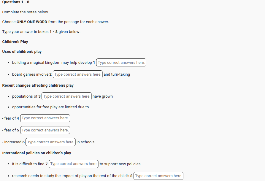 | IELTS READING THE IMPORTANCE OF CHILDREN’S PLAY reading practice test has 10 questions belongs to Child Development & Education subject.. |