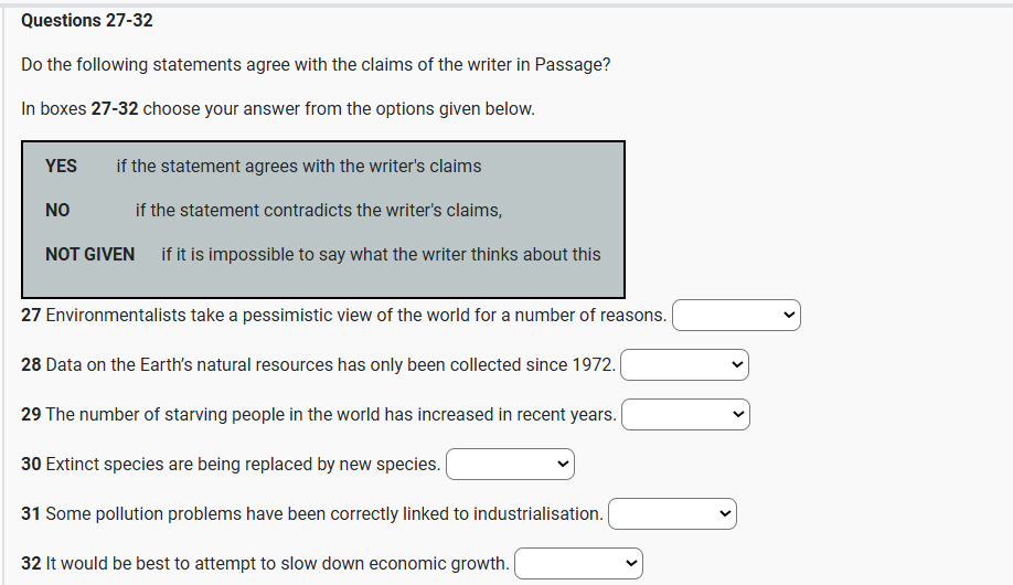 Q27 For many environmentalists, the world seems to be getting worse. They have developed a hit-list of our main fears: that natural resources are running out; that the population is ever growing, leaving less and less to eat; that species are becoming extinct in vast numbers, and that the planet’s air and water are becoming ever more polluted.