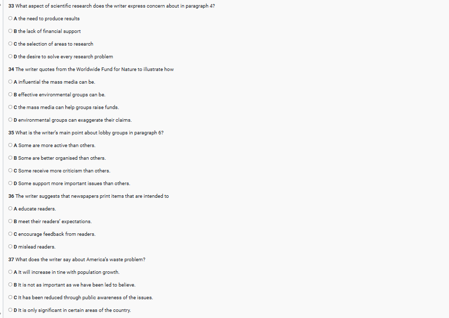 Q32 Secondly, environmental groups need to be noticed by the mass media. They also need to keep the money rolling in. Understandably, perhaps, they sometimes overstate their arguments. Q34 In 1997, for example, the World Wide Fund for Nature issued a press release entitled: ‘Two thirds of the world’s forests lost forever’. The truth turns out to be nearer 20%.