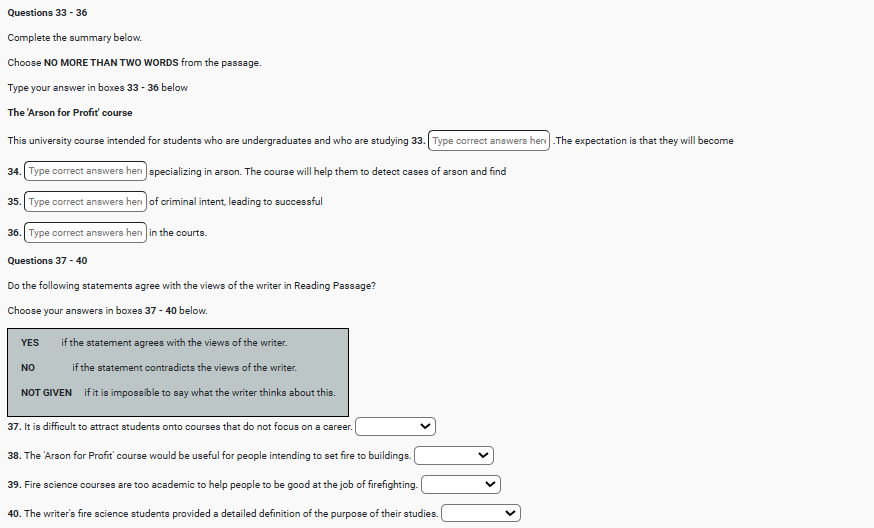 B. Naturally, Q28&34 the course is intended for prospective arson investigators, who can learn all the tricks of the trade for detecting whether a fire was deliberately set, discovering who did it, and establishing a chain of Q35 evidence for effective Q36 prosecution in a court of law. Q28 But wouldn’t this also be the perfect course for prospective arsonists to sign up for? My point is not to criticize academic Q39 programs in fire science: they are highly welcome as part of the increasing professionalization of this and many other occupations. However, it’s not unknown for a firefighter to torch a building. This example suggests how dishonest and illegal behavior, with the help of higher education, can creep into every aspect of public and business life.