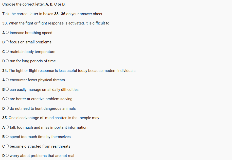 Without this Q27 instinctive response, the human race would never have survived, but at present it is often more of a hindrance than a help. Although instances of physical Q28 threats have decreased over the years, activation of the fight or flight response has actually increased, largely in response to mental frustrations. This poses a problem, however, because the fight or flight mechanism functions most helpfully as a response to something that can cause bodily harm, such as a falling tree or a wild animal, rather than in response to a fulminating boss, a traffic jam, or a spouse who has not returned a phone call. During these instances of mental distress, the physical manifestations of fight or flight, such as an inability to think rationally and calmly, can actually exacerbate the problem. A similar case of an evolutionary development overstaying its welcome is the example of ‘mind chatter’. Mind chatter is the ceaseless train of scattered thoughts and self-talk that occupies our mind, ensuring we are always ‘switched on’, searching for danger and threats. This would have been a boon for a solitary caveman on a three-hour hunting expedition, but in a modern world already overloaded with sensory input, it causes us to fret about non-existent predicaments and occasionally needlessly triggers the fight or flight response.