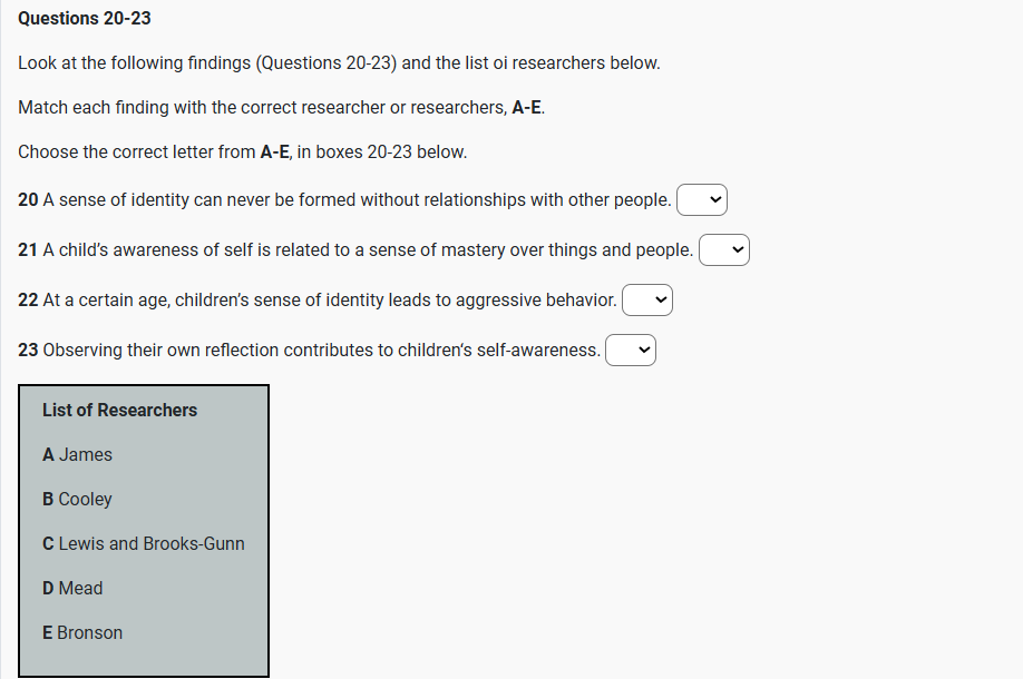 F. Cooley and other researchers suggested a close connection between a person’s own understanding of their identity and other people’s understanding of it. Cooley believed that people build up their sense of identity from the reactions of others to them, and from the view, they believe others have of them He called the self- as-object the ‘looking-glass self’, since people come to see themselves as they are reflected in others. Mead (1934) went even further, and saw the self and the social world as inextricably bound together. The self is essentially a social structure, and ¬it arises in social experience. Q20 It is impossible to conceive of a self-arising outside of social experience.’