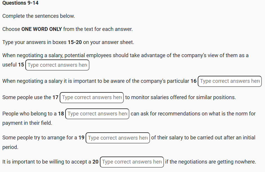 IELTS READING Negotiating a better salary package for your new job Reading Practice Test has 10 Questions belongs to the Business / Employment subject.. |