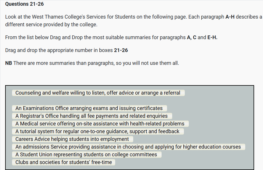 IELTS READING WEST THAMES COLLEGE SERVICES FOR STUDENTS Reading Practice Test has 10 Questions belong to the Education & Student Services. |