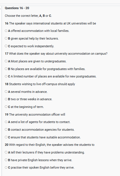 As with everything in short supply, the good accommodation gets snapped up months before the beginning of term – in other words, if you’re starting in October you need to be thinking about it in June or at the very latest July. So you do need to think very carefully about what you need, how much you can afford to pay, well in advance. What you can’t do is leave it until a few days before the start of term. Q19 The agencies in town are pretty good – it’s just a matter of contacting them in good time. Of course, we have a full-time accommodation officer available to help all students. She’ll get in touch with you when you’re accepted – she’s got plenty of contacts in the town and will deal with the agencies on your behalf.