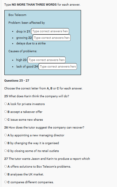TUTOR: Right, Jason and Karin, now I asked you to look at the ease study for Box Telecom as part of your exam assessment. It’s interesting because they are in the middle of problems at the moment and I want you to track how they deal with them. Let’s start with you, Karin. Having read through the ease study, can you just summarise what the problems were that Box Telecom had to take on board?