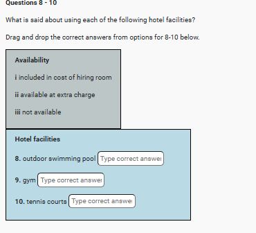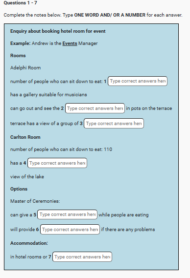 | IELTS Listening Enquiry About Booking hotel Room For Event listening practice test has 10 questions belongs to the Services & Accommodation subject. |