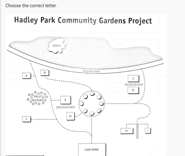 Even Okay, Group B, your turn. Does everyone have a copy of the plan? Oh, great. Okay, we’ll all be meeting in the car park that’s on the bottom of the plan see. Now, if you’ve been assigned to the vegetable beds to get there, you go out of the car park and go up the footpath until you reach the circle of trees. Q15 There they are in the middle of the plan, and you see that the footpath goes all the way around them. Well, on the left-hand side of that circular footpath, there’s a short track which takes you directly to the vegetable beds. You could see a bamboo fence mark just above them. All right. Okay. If you’re helping out with the bee hives, pay attention. Look again at the circle of trees in the middle of the plan and the footpath that goes around them. On the right side of that circle, you can see that the footpath goes off in an easterly direction, heading towards the right-hand side of the plan. And then the party splits into two and you can either go up or down. Q16 You want the path that heads down, and at the end of this, you see two areas divided by a bamboo fence. And as we’re looking at the plan, the bee hives are on the right of the fence. The smaller section, I mean, now, don’t worry. All these have been removed. You just need to transport the hives back to the car park. Okay for this eating, Q17 look at the circular footpath at the top of it. There’s a path that goes from there on takes you up to the seating area alongside the bicycle track. And, with a good view of the island, has suppose. Okay, if you’re volunteering for the adventure playground area, Q18 let’s start from the car park again and go up the footpath but then you want the first left hand. Go out there and then you see, there’s a short part that goes off to the right. Go down there. And that’s the adventure playground area above the bamboo fence. That fence does need repairing, I’m afraid. Right. What else? Oh, yes, the sand area. We’ve got that circular footpath in the middle. Q19 Find the track that goes east towards the right-hand side of the plan. On where that track divides, you need the little path that goes up towards the bicycle track. The sand area is just above the bamboo fence there. And finally, Q20 the pond area. So it’s on the left-hand side of your plan towards the top, just above the fruit bushes, and to the left of the little path. Okay. As I said already, hopefully, will be.