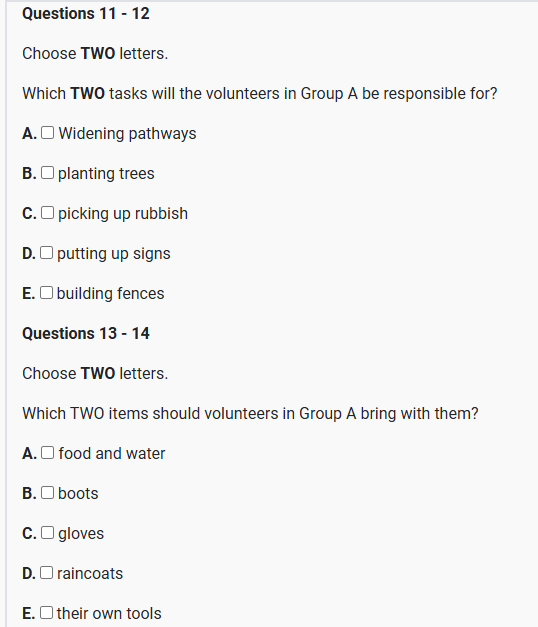 Q11 The priority for you will be to give us a hand with the new wooden fencing it needs constructing along parts of the bicycle track as there are parts which have now fallen down or broken. As I’m sure you’ve seen, you probably also noticed that some of the pathways that come from the bicycle track are quite narrow, and there are plans to make them wider. But the council will be dealing with that later in the year and they’ve also promised to produce some informational signs about the plants in the gardens. Hopefully, they’ll be up in a few weeks time. The other thing Q12 we’re doing is getting rid of some of the foreign species that are growing in the gardens on putting back from native plants and trees. So you’ll be doing some digging for us and getting those into the ground. So Group A, there’s some items you’ll need to bring along with you. I was going to say raincoats, but the forecast has changed so you can leave those at home. I definitely recommend a strong pair of Q13 boots. Waterproof would be best. It’s quite muddy at the moment on your own. Q14 Gloves would also be advisable. Tools will be available, spades and hammers, that kind of thing. You just need to make sure they go back in the trucks and oh, there’s no need to worry about food and drink as well. Be supplying sandwiches and coffee possibly some biscuits.