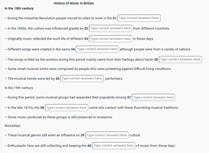Most people resided in small rural communities where their lives revolved around farming, life for the average person was difficult as incomes were meager and malnourishment and disease were common. Despite the difference in nationalities of the people and the variety of musical genres all of the music shared one common Q34 language English, as many were unable to write the songs were a means for the people to give voice to their experiences and feelings about their hard and laborious Q35 jobs, most of the music written by the workers during this period has been lost as a result of illiteracy and aware of time. Now you may be asking yourselves how these small musical works were formed. The roots of most of these groups can mostly be traced back to the younger members of the working classes, who were perhaps rebelling against the inferiority of their living and working conditions compared to those of the upper classes. Q36 Young performers would often lead these musical trends usually possessing a great talent for singing or playing particular handmade instruments. As time progressed into the 19th century these musical groups had gained much notoriety and would hold small performances in the street for all to watch. It was perhaps their blind optimism and rebellious spirit that led them to become so popular with their Q37 audiences. Which were usually made up of the poorest of the poor despite efforts by the Q38 upper classes to put an end to these musical traditions they continued to gain popularity and flourish. By the late 1870s, they had evolved past the barrier of the social echelons and gained access to the middle class.