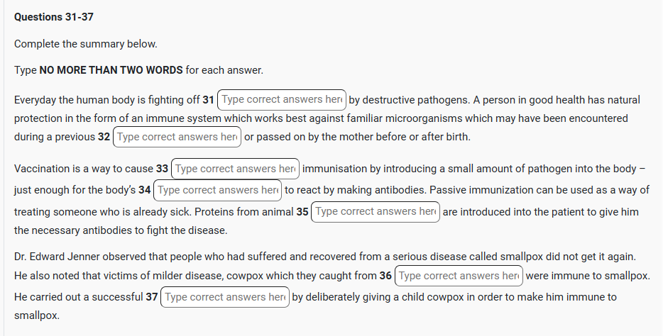 There are two ways in which humans acquire natural immunity. Actively, when a person has first suffered and then recovered from an illness and passively when ready-made protection is transferred into the body, for example, from the maternal blood fire the umbilical cord to an unborn child or through breast milk. Now artificially acquired immunity can help the body to fight Q32 disease so we can use active immunization as a preventative measure. This is when a person is vaccinated against illness by injection or oral ingestion of a tiny amount of weakened or Q33 inactive germs not enough to actually cause him or her to contract the illness, but sufficient for the body’s Q34 defence system to recognize and respond to the threat by forming antibodies. Intervention using passive immunization, on the other hand, is a method of curing an illness after it is too late for prevention. It is less effective than active immunization and takes longer to work. It is used when the body has already been invaded by bacteria and the person is ill. In this case, there is no time for the body to make antibodies of its own. So proteins, usually taken from the Q35 blood of animals are injected to equip the patient with the essential antibodies to combat the particular illness. Let’s have a quick look at a bit of history. The discovery of vaccination to boost the body’s immune system by making it sensitive to particular disease-causing bacteria was made by an 18th-century English doctor cooled Edward Jenna.