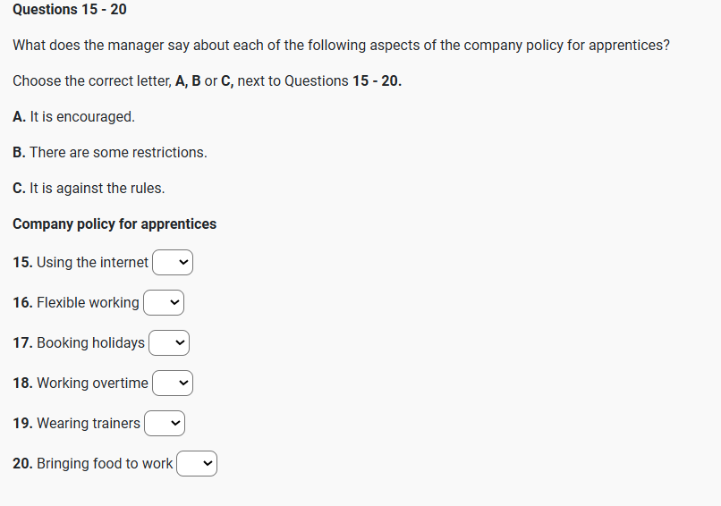 As part of your job you’ll be doing some research online so obviously, you’ll have unlimited access for that but Q15 please don’t use it for personal use -you’ll have your own phones for that. Some of you have already asked me about flexible working. After your probationary three-month period – some of you will be eligible for this – but it will depend on which department you’re in and what your personal circumstances are. Q16 So please don’t assume you’ll automatically be permitted to do this. I want to make sure there’s no confusion about our holiday policy. Apart from any statutory public holidays, we ask that Q17 you don’t book any holidays until after your six-month apprenticeship has finished. Time off should only be taken if you are unwell. Please speak to your supervisor if this is going to be a problem. You’ll be expected to work a 40-hour week but Q18 there may be opportunities to do overtime during busy periods.   Although you’re not required to do this, it can be a valuable experience – so we advise you to take it up if possible. Obviously, we understand that people do have commitments outside work, so don’t worry if there are times when you are unavailable.