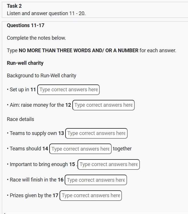 | IELTS Listening – Run-well Charity Event and Fundraising listening practice test has 10 questions belong to the Talk about a Charity Event (Run-Well) |