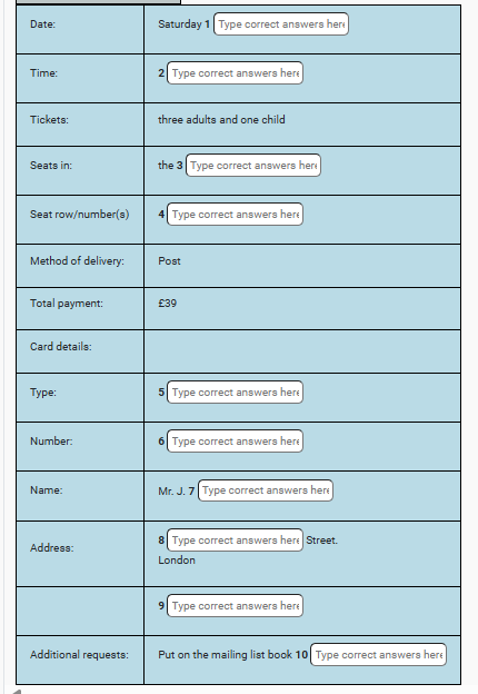 Woman: So let’s see. That comes to? 38 altogether for the tickets. How do you want to collect them? Shall I put them in the post? They’d be sent today by first class mail, and there’d be an additional charge of £1 to cover postage and administration. Or do you want to get them from the box office yourself?
