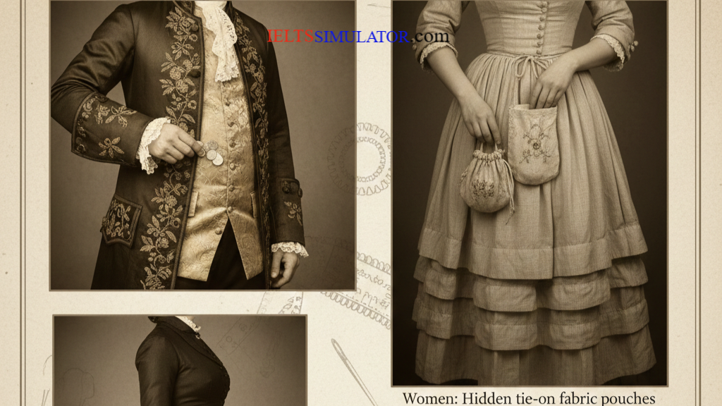 It’s certainly very interesting to go back in time and see how pockets developed for men and women. In the 18th century, fashions were quite different from the way they are now, and pockets were too. If we think about male fashion first … that was the time when suits became popular. Q32 Trousers were knee-length only and referred to as ‘breeches’, the waistcoats were short and the jackets were long, but all three garments were lined with material and pockets were sewn into this cloth by whichever tailor the customer used. Q33 The wearer could then carry small objects such as pencils or coins on their person and reach them through a gap in the lining. Coat pockets became increasingly decorative on the outside for men who wanted to look stylish, but they were often larger but plainer if the wearer was someone with a profession who needed to carry medical instruments – a doctor or physician, for example. Q34