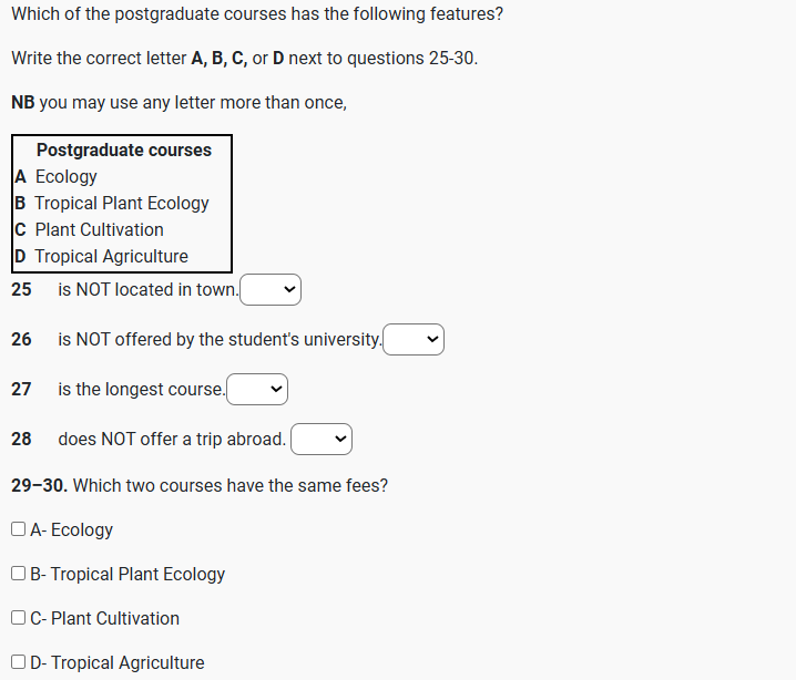 The Tropical Farming course is, as you might expect, almost twice the cost of the course is based domestically, while the Tropical Ecology course is one and a half times as expensive. Hmm, thanks. I’ll give all of that some thought. So, what are your plans when you have completed your post-grad? I’m not sure yet. I suppose, ultimately, I’d like to work for the United Nations. Something like the Food and Agricultural Organization. That would be my ideal, but there are so many really good charities, NGOs and research institutes out there. Sounds good. Well, good luck. Thanks. See you later.