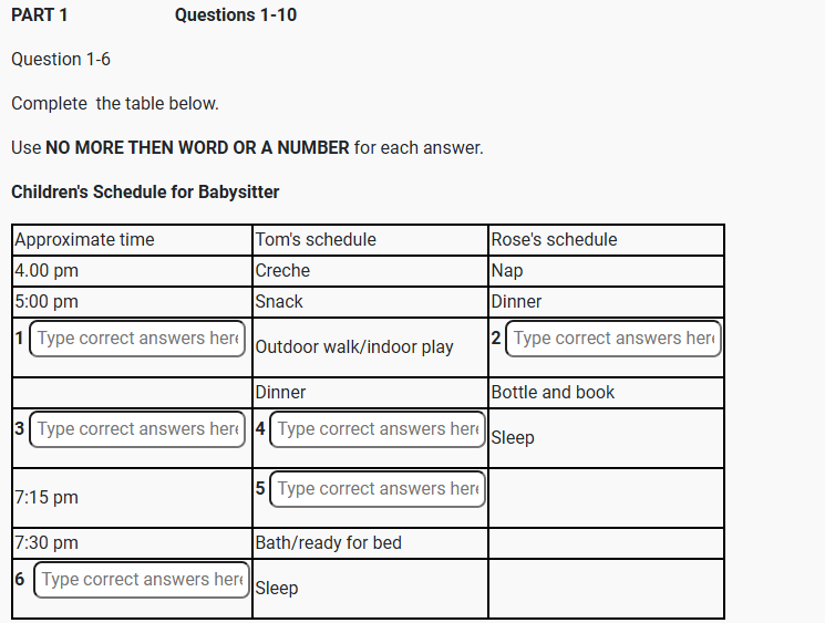 Now, Rose has her dinner about five. I’ve left some jars of baby food in the fridge, but they’ll need to be warmed up. While Rose is eating, give Tom a snack. Something like a banana or slices of apple would be fine. I see. At about 5.30, I like to give Rose a bath. You’re all right giving the baby a bath.